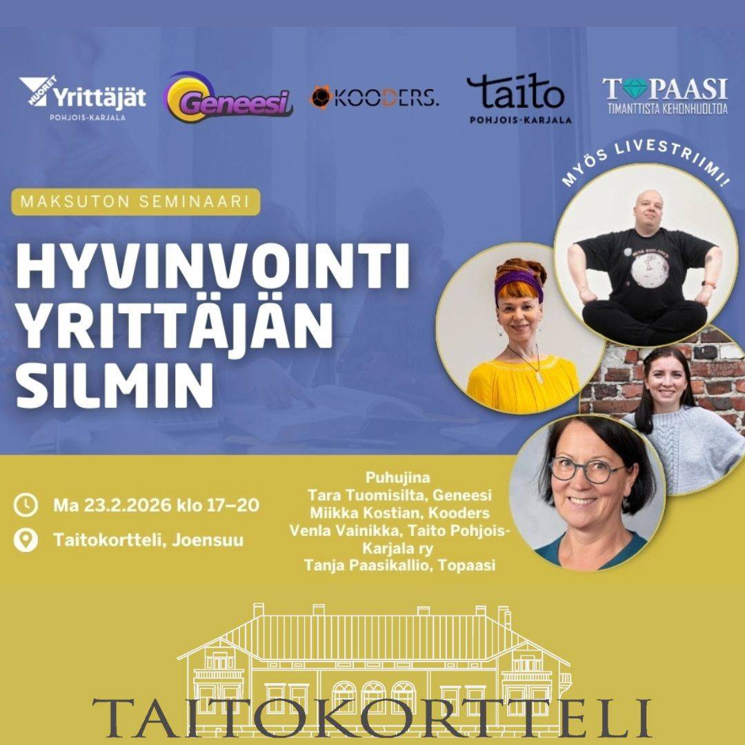Järjestäjinä toimivat Pohjois-Karjalan Nuoret Yrittäjät ja Geneesi. Tapahtumaa tukemassa Taito Pohjois-Karjala ry ja Kooders. Ilmoittaudu viimeistään sunnuntaina 15.2. täällä.