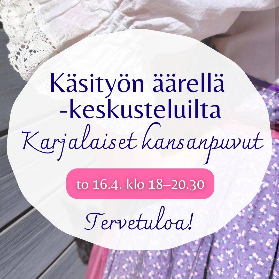 Käsityön äärellä -keskusteluillassa pysähdytään perinteisten pukujen äärelle. Illan aikana tutustutaan kansallis- ja kansanpukujen historiaan, merkityksiin ja käyttöön sekä siihen, miten ne heijastavat identiteettiä, paikallisuutta ja sukupolvien ketjua.