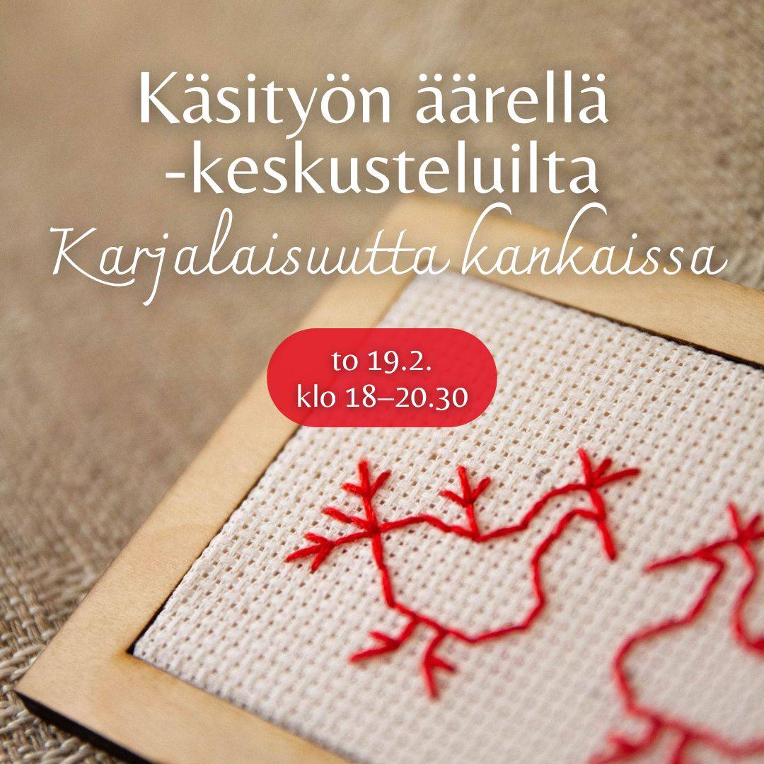 Käsityön äärellä –keskusteluillassa pysähdytään karjalaisten kankaiden, käsityöperinteen ja muistojen äärelle. Käsitöiden tekeminen on hidasta ja rauhoittavaa – tekemisen lomassa syntyy tilaa ajatuksille, tarinoille ja yhteiselle keskustelulle. Käsityöt kantavat mukanaan historiaa, identiteettiä ja sukupolvien välistä tietoa, joka elää myös aineettomana perinteenä.