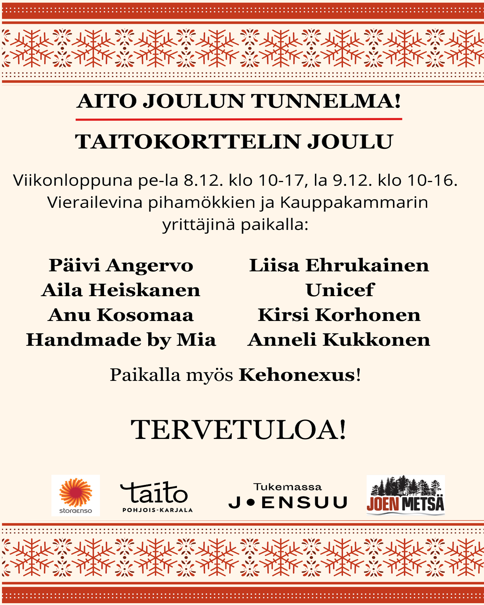 Taitokorttelin Joulu on nyt avoinna. Koe aito joulun tunnelma keskellä Joensuuta. Luvassa paikallisia yrittäjiä yhdessä Taitokorttelin omien yrittäjien kansa tarjoamassa jouluisia tuotteitaan. Ihastuttavaa joulun tunnelmaa on luomassa tunnelmallinen valaistus, jouluiset koristelut sekä jouluinen tunnelmamusiikki. Lisäksi lauantaisin ja sunnuntaina luvassa monenlaista ohjelmaa.